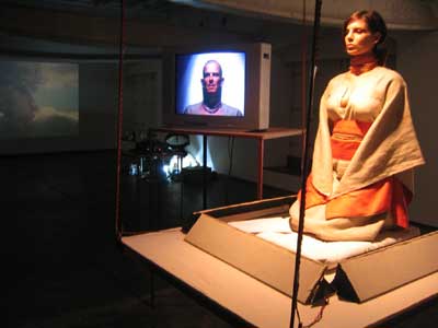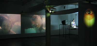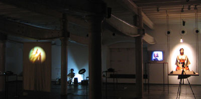 a multi-media production in a new gallery space, using still projections, live cameras, televisions, and a video projection.